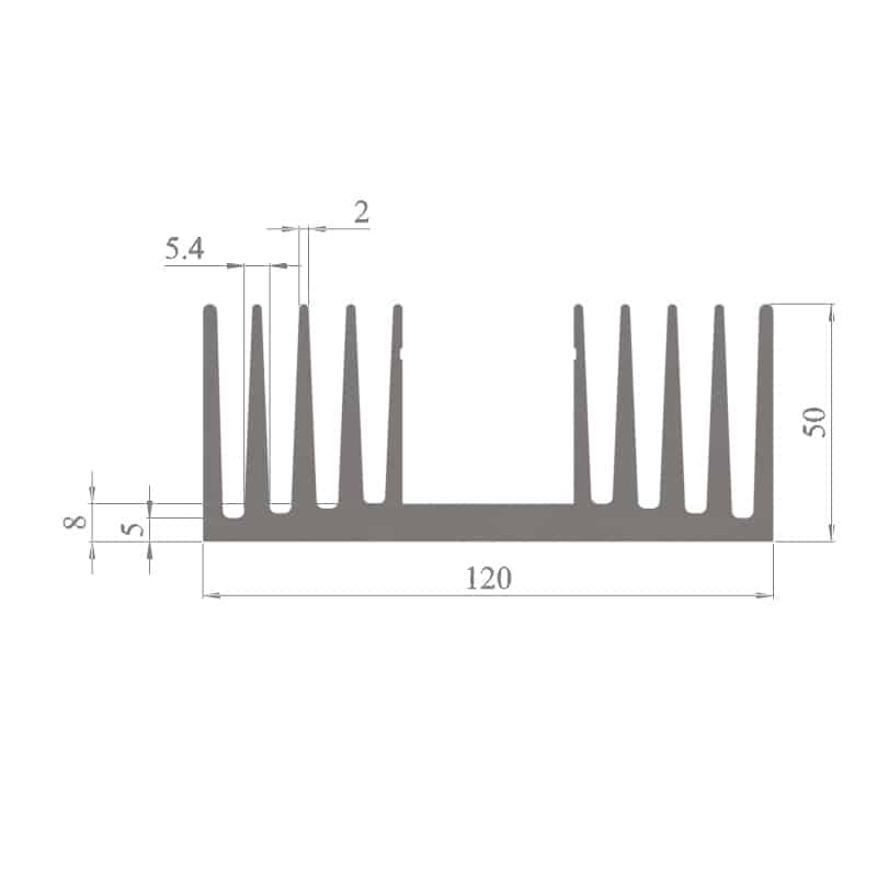 Standard Heat Sink Aluminum alloys, height 50 mm, width 120 mm, fin width 2 mm, unit length and quantity according to customer's requirement.